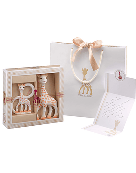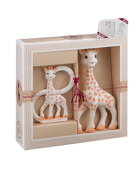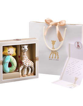Regalo perfecto para baby shower!! Incluye Sophie la girafe + Heart Rattle + Bolsa + Tarjeta de Regalo. Heart Rattle: cascabel ligero y fácil de atrapar y manipular, está perfectamente adaptado a las pequeñas manos del bebé. Sophie la girafe: mordedor de caucho 100% natural, que estimula los 5 sentidos de la guagua y alivia las molestias de la dentición.
